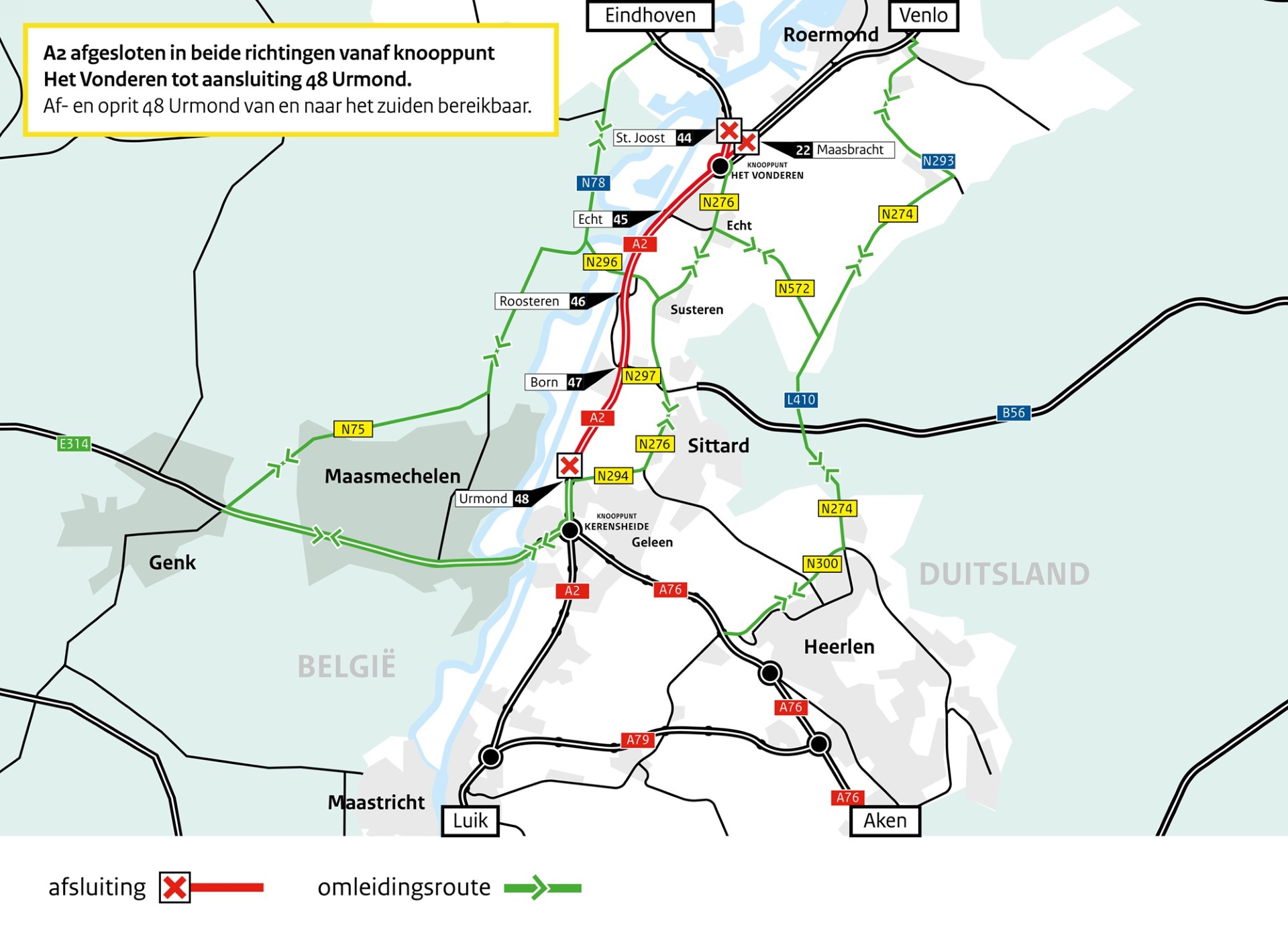 Regionaal/lokaal verkeer ten westen van de A2 wordt omgeleid via België (N75/N78) Maasmechelen. Het regionale verkeer aan de oostkant van de A2 met bestemmingen Urmond, Born, Echt-Susteren worden omgeleid via de N276.