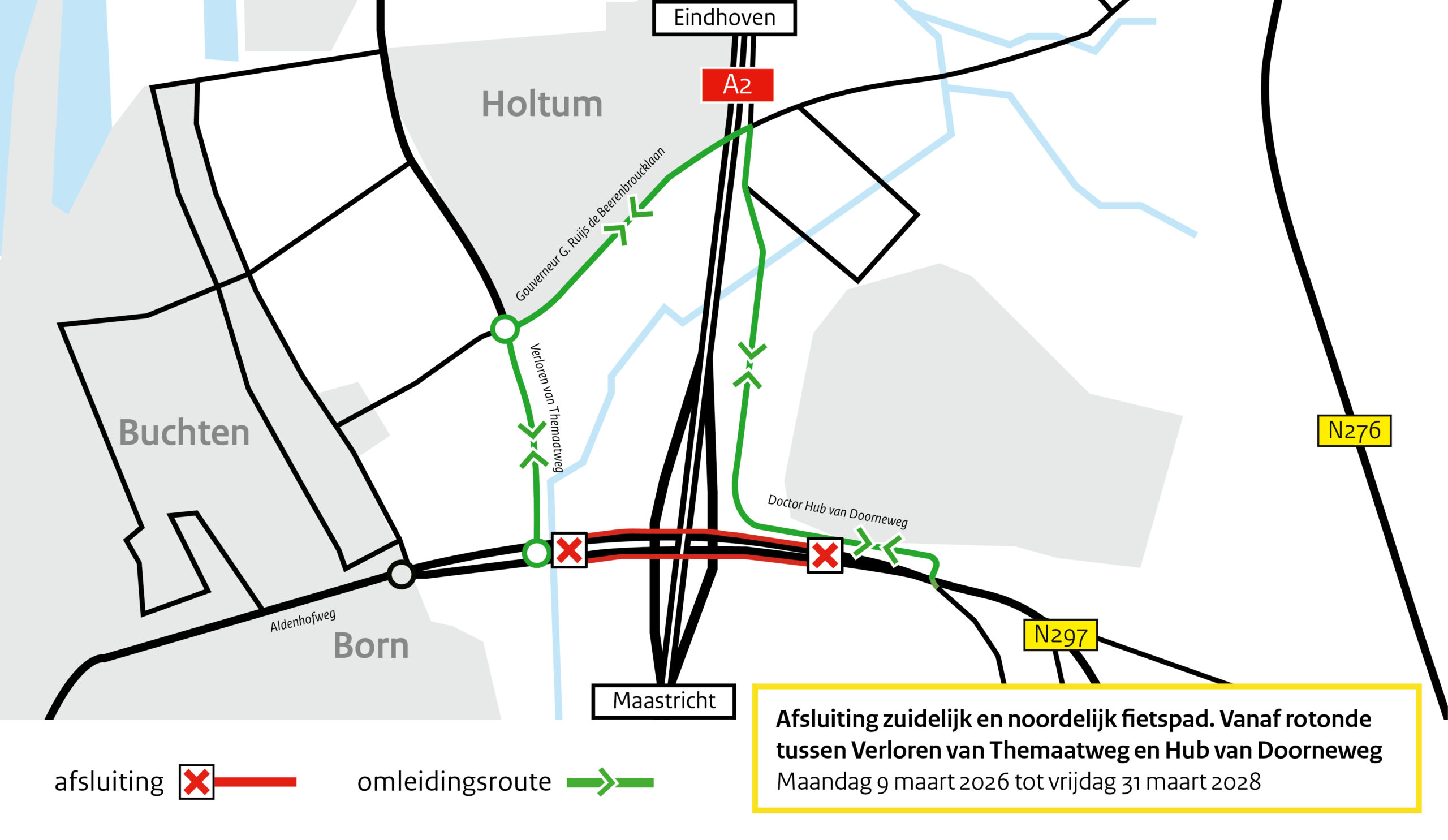 Afsluiting fietspad N297 De noordelijke en zuidelijke fietspaden zijn vanaf 9 maart 2026 tot 31 maart 2028 afgesloten tussen de rotonde ter hoogte van de Verloren Themaatweg en de Hub van Doorneweg.